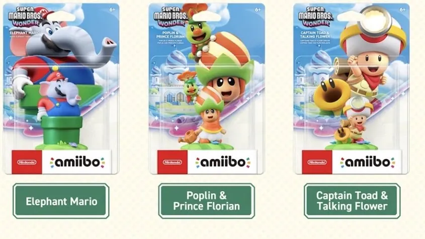 Μαζί με το launch στις 26 Μαρτίου έρχονται τρία νέα amiibo: Elephant Mario, Poplin & Prince Florian και Captain Toad & Talking Flower. Επιπλέον, η Nintendo ανακοινώνει και το φυσικό προϊόν Talking Flower με κυκλοφορία στις 12 Μαρτίου στο My Nintendo Store και επιλεγμένους retailers, με pre‑purchase να ξεκινά άμεσα στο My Nintendo Store.