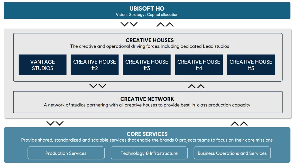 Η Ubisoft χωρίζει τις δημιουργικές της λειτουργίες σε 5 “Creative Houses”, ένα νέο αποκεντρωμένο μοντέλο που συνδυάζει παραγωγή και publishing και δίνει «end‑to‑end» ευθύνη (δημιουργική + οικονομική) σε κάθε μονάδα. Παράλληλα, θα υπάρχουν υποστηρικτικές ομάδες όπως το Creative Network (co-development και παραγωγική υποστήριξη) και τα Core Services (τεχνολογία, QA, localization, planning κ.ά.).