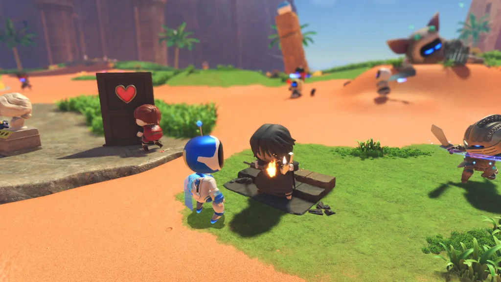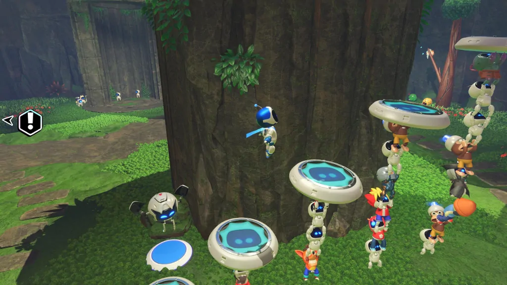 Πέραν αυτών, ο συγκεκριμένος ανεξάρτητος πλανήτης είναι στην ουσία και ένα hub-άκι των υπόλοιπων επιλογών που προσφέρει το ASTRO BOT σε ό,τι έχει να κάνει με την πρόοδο της ιστορίας και το customization. Με ένα σφύριγμα του ASTRO όλα – και το εννοώ, ΟΛΑ – τα bots που έχουμε επαναφέρει μας ακολουθούν και συνεργάζονται για να δημιουργήσουν σκάλες, πυραμίδες, τοίχους και να φτιάξουν μονοπάτια στον σωτήρα τους. Είναι ξεκαρδιστικό το να παρακολουθούμε αυτές τις σκηνές ασόβαρης συνεργασίας και τσιριχτών ανάμεσά τους, αφού δεν φανταζόμουν ποτέ πώς θα χρειαζόμουν ποτέ μου την από κοινού βοήθεια του Pyramid Head, του Ryu, του Trico και πάει λέγοντας.