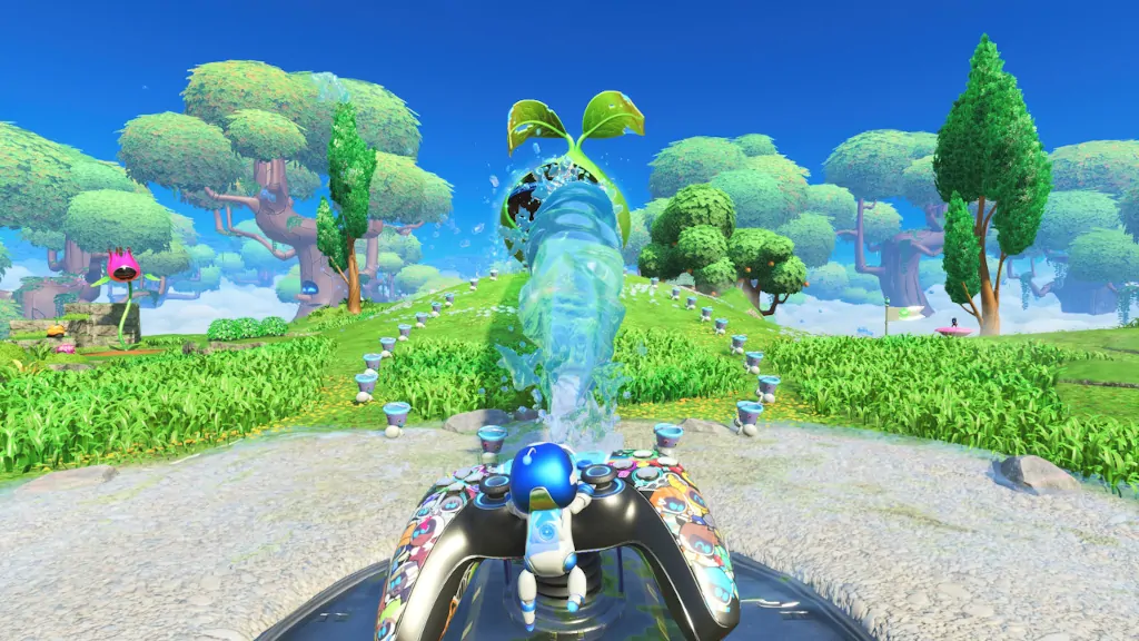 Εντός αυτών των όλο ζωντάνια levels, υιοθετείται το ίδιο gameplay δίστιχο του ASTRO’s Playroom, εφόσον ο ASTRO αντιδρά μόνο όταν πατάμε ✖️ για να πηδήξει ή να περιίπταται, και το ⬛ για να εξαπολύσει τις χαριτωμένες μπουνίτσες του. Δεν θα λέγαμε «όχι» σε μία έστω διακριτική ανοικοδόμηση του χειρισμού, αλλά θα ήταν άδικο να ισχυριστούμε πως η Team Asobi σταμάτησε εκεί. Αυτό διότι στην πλειονότητα των βασικών πιστών ο ASTRO συναντά σεντούκια που κρύβουν μέσα τους ένα νέο gimmick/power-up που έρχεται να κουμπώσει στα δύο adaptive triggers (L2/R2) και να μετατρέψει αυτομάτως το παιχνίδι σε κάτι πολύ πιο ξεσηκωτικό. Μιλάμε για long-range γροθιές με βατραχο-ελατήρια, προβοσκιδο-σκούπες που ρουφάνε ρευστά και δημιουργούν πλατφόρμες, μπουλντογκο-τζέπτακ εκτόξευσης, και άλλα πολλά εργαλεία που μεταμορφώνουν – έστω προσωρινά – τις ικανότητες του ASTRO και λαχταρούν να διασκεδάσουν τον παίκτη με τις νέες προοπτικές που δημιουργούν, τόσο για την αντιμετώπιση των εχθρών όσο και για το platforming.