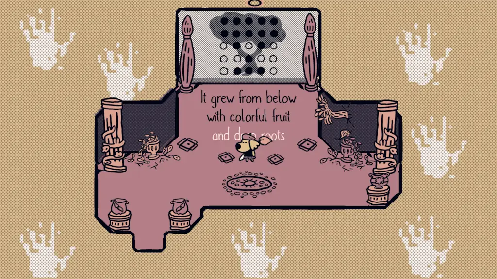 Όσον αφορά το design του, δεν υπερβάλλω όταν λέω πως αυτό το videogame πλησιάζει με πολλούς τρόπους την τελειότητα. Είναι πραγματικά συγκλονιστικά καλοσχεδιασμένο μέχρι το κόκαλο. Είναι σχεδόν αμέτρητες οι λεπτομέρειες που θα μπορούσα να αναφέρω. Μ’ αρέσει πολύ όταν ένα game έχει πολλές ιδέες. Πολλές μη συστημικές, ξεχωριστές ιδέες που μου δίνουν μια μοναδική και ανεπανάληπτη απόλαυση στο πρώτο playthrough. Το Chicory έχει πάρα πολλές τέτοιες ιδέες. Οι ιδέες του, όπως σε κάθε εξαιρετικό game, απορρέουν φυσικά από τα συστήματά του αλλά δεν περιορίζονται σε αυτά.