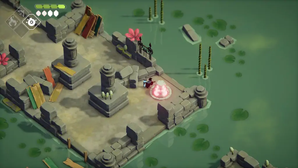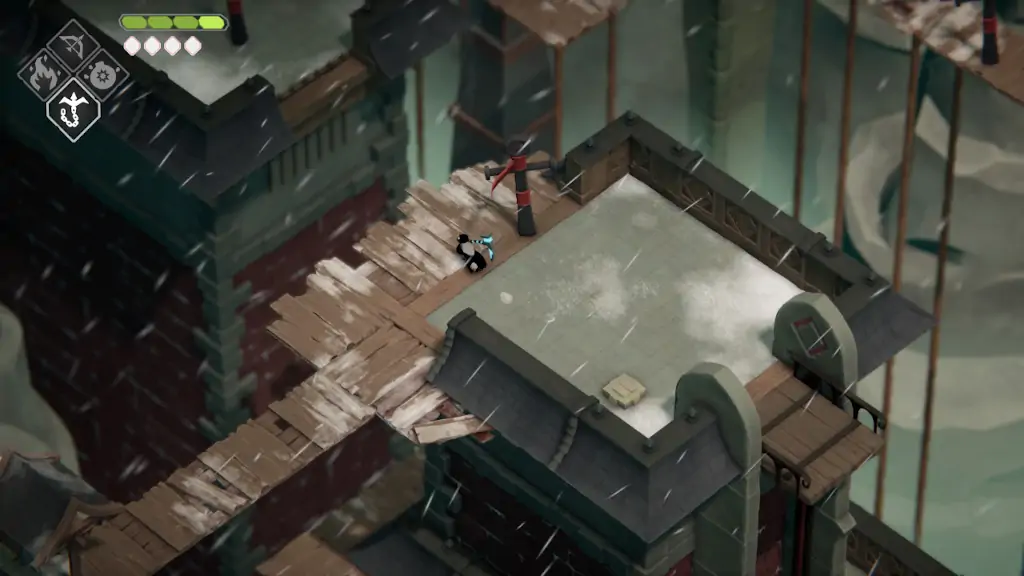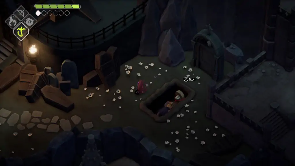 Ξέρουμε όλοι τι πρέπει να γίνει άμα δούμε ένα ραγισμένο τοίχο ή έναν πυρσό που είναι σβηστός σωστά; Άλλοι περιβαλλοντικοί γρίφοι και μυστικά απαιτούν λίγη παραπάνω παρατηρητικότητα, όπως το να εντοπίσετε κρυφές εισόδους στα dungeon, για παράδειγμα με την αντανάκλαση του δαπέδου σε ένα μπάνιο. Ο κόσμος του Death’s Door είναι γεμάτος με αυτούς τους γρίφους και τους απόλαυσα όλους! Το level design έχει πολύ potential, ειδικά μετά τη μέση του παιχνιδιού δείχνει ότι αν ήταν μεγαλύτερο το παιχνίδι θα μπορούσαν να έχουν κάνει πολύ δυνατά πράγματα, χωρίς να θέλω να αφαιρέσω τίποτα από αυτά που ήδη έχει το παιχνίδι. Θα επαναληφθώ και θα πω: τίμιο Zelda-like. Επίσης, το περιβάλλον έχει έναν πλουραλισμό. Έχουμε το κεντρικό Lost Cemetery που είναι το hub για όλο σχεδόν το παιχνίδι. Από εκεί και μετά βρίσκουμε έπαυλη, κήπο, κάστρο, ερείπια, παγωμένα βουνά, ένα εργαστήριο και άλλα, που δεν θα πω, για να βρείτε και κάτι μόνοι σας.