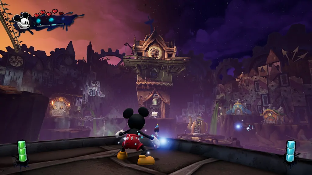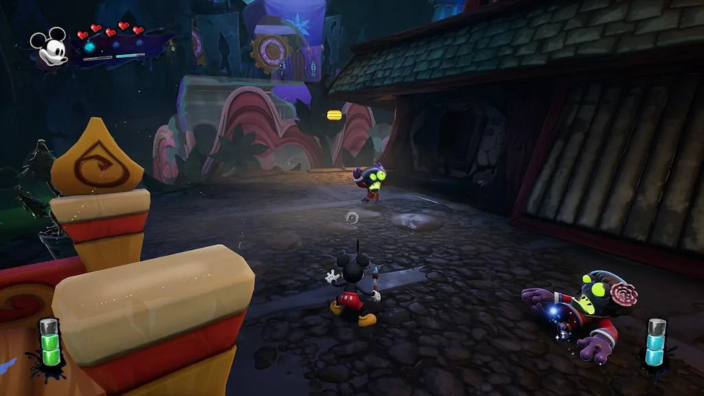 Μπαίνοντας στη γειτονιά του gameplay, τα πράγματα είναι πάνω κάτω όπως θα τα περίμενε κανείς από το τυπικό 3D platformer. Στο Epic Mickey: Rebrushed περιηγείσαι σε εμπόδια στον ερειπωμένο κόσμο, πολεμάς εχθρούς, λύνεις γρίφους και συλλέγεις διάφορα collectibles. Το κύριο χαρακτηριστικό του παιχνιδιού, το οποίο πάει χέρι-χέρι με το σύστημα ηθικής, είναι ότι μπορείς να χρησιμοποιήσεις το πινέλο σου είτε για να δημιουργήσεις διάφορα αντικείμενα και χαρακτήρες στο περιβάλλον είτε για να τα καταστρέψεις. Στις περισσότερες μάχες, μπορείς να επιλέξεις είτε να «ελέγξεις» κατά κάποιο τρόπο τους εχθρούς σου με μπογιά ώστε να μην σου επιτίθονται, είτε να τους διαγράψεις από το σύμπαν με το……διαλυτικό; Δεν είμαι σίγουρος πως αλλιώς να το ονομάσω. Το περιβάλλον είναι καθαρά σχεδιασμένο με τον συγκεκριμένο μηχανισμό κατά νου, καθώς είναι γεμάτο με διάφορες φθαρμένες επιφάνειες και αντικείμενα που μπορείς να επιλέξεις αν θες να συμπληρώσεις ή να διαγράψεις. Η επιλογές σου αυτές επηρεάζουν άμεσα την συνολική εμπειρία σου, με το platforming να γίνεται σημαντικά πιο εύκολο και τα κρυμμένα μυστικά να αποκαλύπτονται.