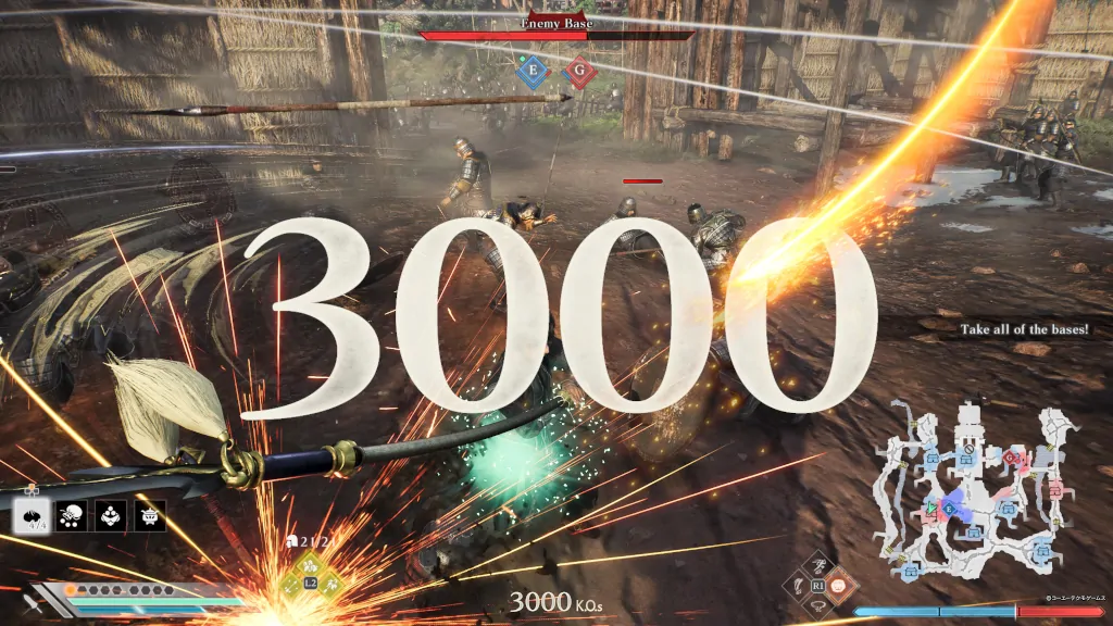 Η λογική είναι ίδια. Η καλύτερη άμυνα είναι η καλή επίθεση. Οπότε είτε η αποστολή μας θέλει να προστατέψουμε/κατακτήσουμε μία βάση, είτε να νικήσουμε/σώσουμε έναν πολέμαρχο, η λύση βρίσκεται πάντα στο να χρησιμοποιούμε όλους τους συνδυασμούς που ξεκλειδώνει το όπλο μας για να εξοντώνουμε τους εχθρούς ανά δεκάδες. Αν πατώντας τα κουμπιά σας και εξαπολύοντας τις επιθέσεις σας δεν δείτε τα KOs να πιάνουν τετραψήφιο… κάτι κάνετε λάθος. Γιατί πατώντας ακόμα και τυχαίες αλληλουχίες των βασικών και των ισχυρών επιθέσεων μπορείτε να αφανίσετε τις αντίπαλες μονάδες που συμπεριφέρονται σαν σφήκες γύρω από σφηκοφωλιά. Το μυστικό είναι να μην διστάζετε ποτέ να χωθείτε με τα μπούνια ανάμεσα στις λόγχες και τη βροχή από βέλη.