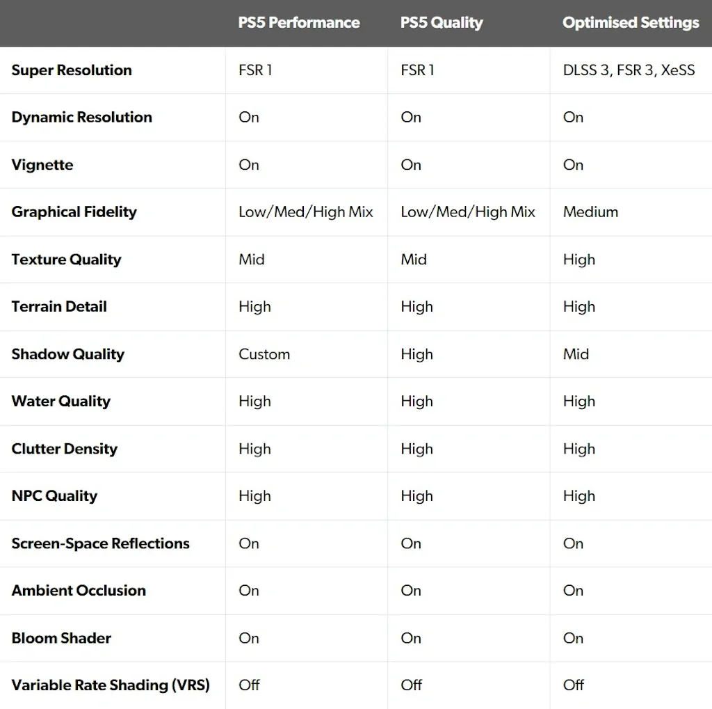 Παρακάτω υπάρχει ο πίνακας με τις επιλογές που θα έπρεπε κανείς να διαλέξει ώστε να έχει την ίδια εικόνα με ένα PS5 σε Performance mode, Quality Mode, αλλά και optimized Settings όπως προτείνονται από το Digital Foundry: