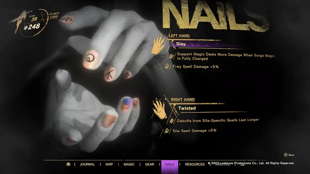 Το Forspoken πειραματίστηκε σχετικά με τα αντικείμενα και τις αναβαθμίσεις του χαρακτήρα. Η κάπα αποτελεί το βασικό item, που είναι υπεύθυνο κυρίως για τη ζωή μας αλλά και για ορισμένα buffs σε μαγείες. Στη συνέχεια έχουμε περιδέραια και σχέδια για τα νύχια, που βοηθάνε στην αύξηση των buffs και αυτά με τη σειρά τους. Οι επιλογές μπορεί φαινομενικά να είναι ελάχιστες, όμως αυτό οδήγησε στο να μην είναι και τόσο υποχρεωτική η συνεχής ενασχόληση με το gear, που ορισμένες φορές κουράζει. Αυτό που σίγουρα απαιτείται όμως, είναι η συχνή αναβάθμιση και γνώση νέων skills, που ευτυχώς δεν επαναλαμβάνονται, προσφέροντας κάτι διαφορετικό και πολλές φορές εντυπωσιακό.