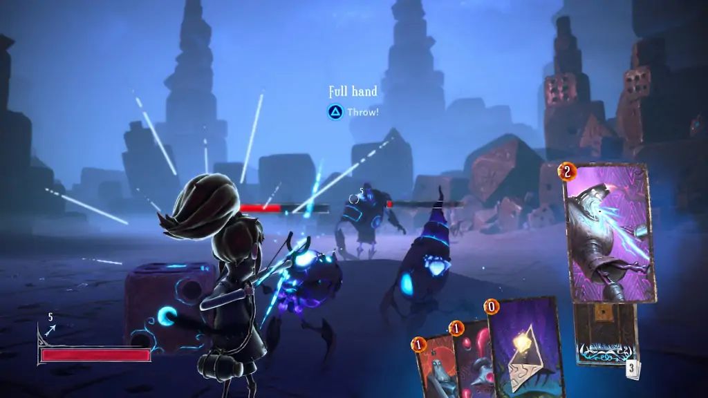 Νιώθετε τυχεροί; Δοκιμάστε τα γούρια σας στις εμπόλεμες ζώνες του Lost In Random, όπου και εδώ η πλειονότητα των διαθέσιμων επιλογών ποικίλει ανάλογα με τη καθοριστική προσγείωση στα βαθμονομημένα οπίσθια του Dicey. Επειδή η Even δεν έχει τα σωματικά προσόντα, ούτε την εμπειρία που απαιτείται για να κατατροπώσει τα εχθρικά πλάσματα, η Zoink της χάρισε ένα συνδυαστικό σύστημα μάχης που εναλλάσσεται ανάμεσα στο action gameplay και σε μία card-based μίξη. Σεναριακά όλα αυτά αποδίδονται ταιριαστά στο ότι η Even μέχρι προχθές έπαιζε κρυφτούλι, κοινώς όσο μαχητικό πνεύμα και αν διαθέτει, δεν μπορεί παρά να χρησιμοποιήσει τη σφεντόνα της ως άμυνα απέναντι σε κάθε γελοιογραφική απειλή. Με τη συλλογή των κρυστάλλων που ξεβράζουν οι ξένες οντότητες η Even έρχεται στην ουσία όλο και πιο κοντά στο να τραβήξει 21, αφού σηκώνει κάρτες για να χρησιμοποιηθούν αποτελεσματικά και με τη στρατηγική που ο καθένας επιθυμεί να ασπαστεί. Μόλις ο Dicey υπερφορτώσει, μπορεί να εκτοξευτεί και να παγώσει το ρυθμό του combat gameplay, για να διαλέξετε πως θα αξιοποιήσετε το deck σας. Μπορεί ως υλοποίηση να έχει μία πιο αποδεκτή ή πρωτόγνωρη κάλυψη της χρήσης καρτών, σταδιακά όμως και αν δεν προβείτε σε πολλές μετατροπές του deck, θα διαπιστώσετε πως το σύστημα μάχης τείνει να αποκτήσει ευθεία γραφική παράσταση ως προς τα περιθώρια δημιουργικότητας.