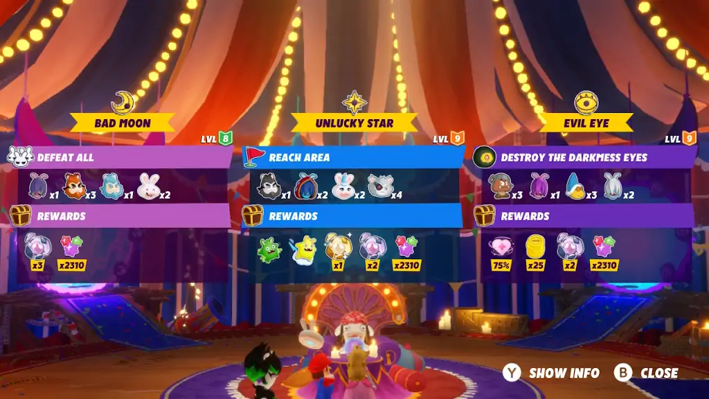 Εγώ που απολάμβανα αμφότερες τις φιλοδοξίες του, ομολογώ πως μου έλειψε λίγο το υποκατάστατο μπάλωμα του εξαετούς κενού ανάμεσα στο σήμερα και το τελευταίο 3D Mario game – και όχι, δεν μετράω το Bowser’s Fury – όμως αντιλαμβάνομαι πως στόχος του συζητηθέντος DLC είναι να προσφέρει ένα αποσπασμένο κομμάτι παιχνιδιού, που εστιάζει στο combat gameplay και φέρει πιο arcade επιρροές. Αυτή η διαφοροποίηση εξηγείται και σεναριακά, εφόσον το μαγικό κάλεσμα της Madame Bwahstrella (Rabbid-μάντισσα που συναντήσαμε στο base game και σε προηγούμενα installments) φέρνει τέσσερις τυχαίους ήρωες από το ρόστερ του κύριου παιχνιδιού για μία «τελευταία» αποστολή, τη διάσωση του φίλου Spawny, τον οποίο έχουν απαγάγει τα εναπομείναντα minions της Cursa και χρόνος για χάσιμο δεν υφίσταται. Στηριζόμενοι, λοιπόν, στο RNG θα συμβιβαστείτε με τους τέσσερις Heroes που η τεχνητή νοημοσύνη θα επιλέξει για εσάς, κρατώντας τους τρεις στο party και έχοντας τον τελευταίο για καβάζτα. Το ίδιο συμβαίνει και με τα Sparks που ελευθερώσατε στο campaign, εφόσον μόλις μία μισοάδεια χούφτα αυτών είναι διαθέσιμη εξαρχής.