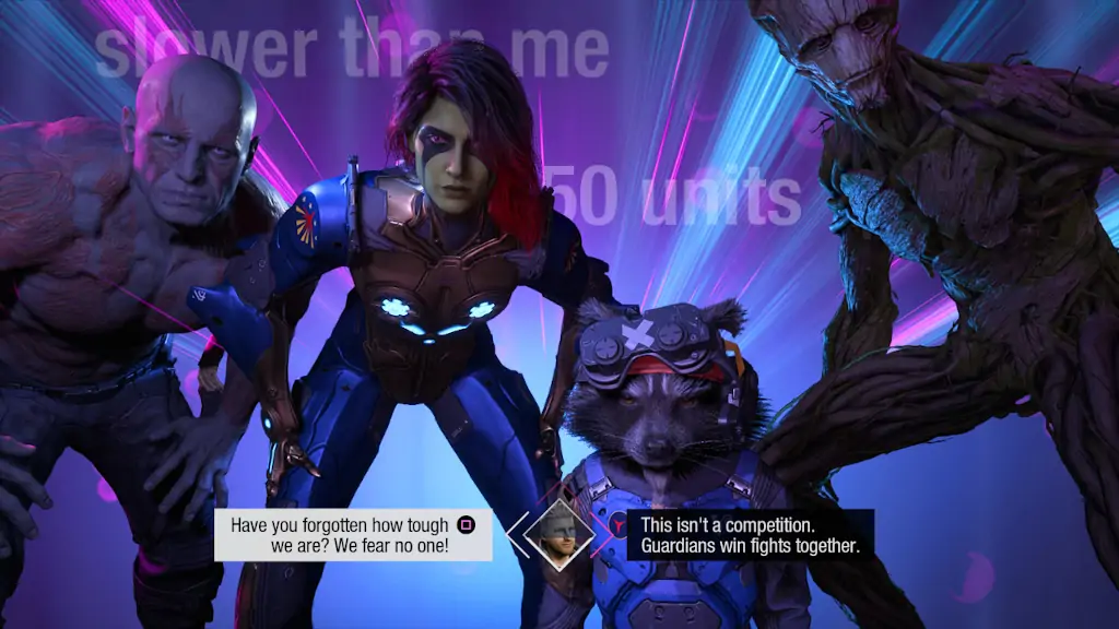 Κάτι που κατέστησε απείρως πιο διασκεδαστικό το combat gameplay κατ’ εμέ ήταν η συνέχεια των διαλόγων και στις συγκρούσεις των Guardians με κάθε απειλή, αφού δεν ξέχασαν στιγμή να ενθαρρύνουν, να κοροϊδέψουν και να βοηθήσουν ο ένας τον άλλο, ενισχύοντας ακόμα περισσότερο το οικογενειακό κλίμα που τόσο πολύ ήθελε να αναπτύξει η Square Enix. Μέρα με τη νύχτα με το Marvel’s Avengers, ειδικά στην αντιμετώπιση της αποτυχίας. Αν αποτυγχάνατε σε κάποιο mission με τον Hulk και τον Iron Man θα ερχόσασταν αντιμέτωποι με το “Mission Fail” και την έναρξη της αποστολής από την αρχή. Το Guardians of the Galaxy του βάζει τα γυαλιά, αντιμετωπίζοντας την αποτυχία με τι άλλο, χιούμορ! Το “Huddle Up” είναι ένα feature που μετατρέπει τον ηγέτη Star-Lord σε ομιλητή, δίνοντας τη δυνατότητα στους παίκτες να ανατρέψουν το πεδίο της μάχης, τονώνοντας το ηθικό των υπολοίπων. Με έναν καλό λόγο, θα πάρετε ακόμα πιο φαντεζί power-ups, ειδάλλως θα αποδοκιμαστείτε από το group μένοντας πίσω στη μάχη. Η εν λόγω προσθήκη είναι ό,τι καλύτερο και ό,τι χειρότερο την ίδια στιγμή, αφού ναι μεν προκαλεί δυσθεώρητο αριθμό από εσωτερικά WTFs, αλλά είναι άκρως αντιπροσωπευτικό του ύφους που όλοι επιθυμούσαμε να εντοπίσουμε στο παιχνίδι.