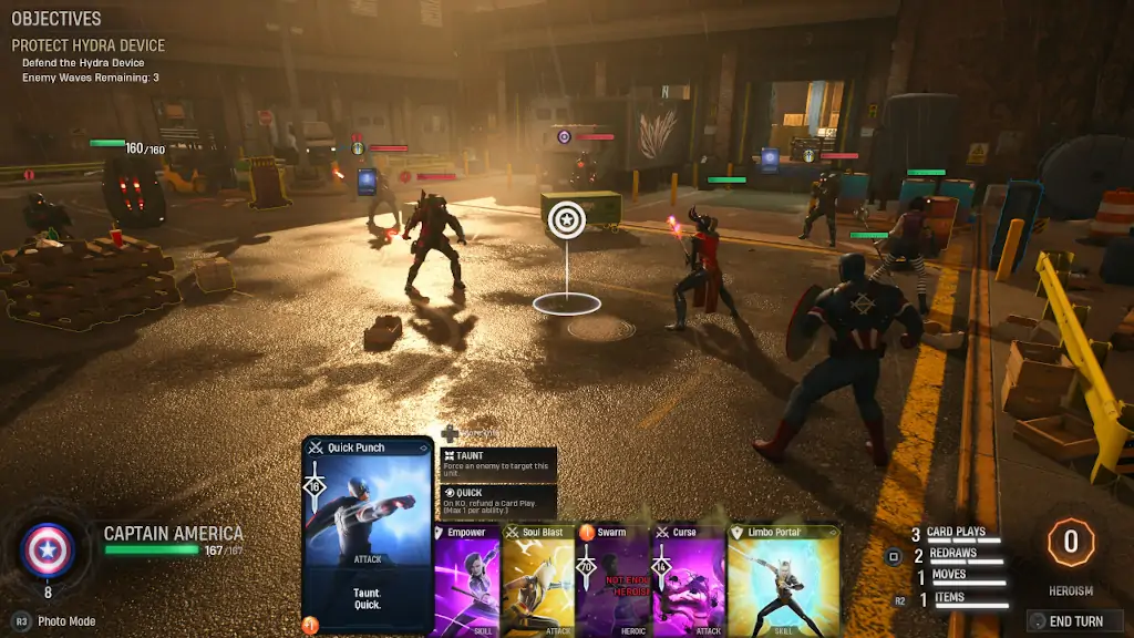 Ομολογουμένως, αν ήθελε η Firaxis θα μπορούσε να το «σκάψει» πολύ βαθύτερα από τακτικής απόψεως, ωστόσο υπάρχει αρετή στην απλότητα των εφικτών επιλογών, ανοίγοντας το spidey-sense προς πιθανές περιπλοκές. Ακόμα πρέπει να διπλοσκεφτείτε προτού πράξετε ή να βγάλετε μέγιστη αξία από κάθε card play ή redraw, εφόσον τα πάντα κοστίζουν έναν αριθμό δράσης. Δεν υπάρχει περιθώριο επιπολαιότητας και συνδυάζοντας όλα τα παραπάνω, λαμβάνουμε ένα από τα πιο συναρπαστικά turn-based συστήματα μάχης, προερχόμενο φυσικά από βετεράνους του είδους. «I can do this all day» σκέφτηκα κατά τα εναρκτήρια tutorials και η στάση μου δεν άλλαξε ούτε σε φάσεις όπου οι ζώρικες αποστολές τράβηξαν παραπάνω turns. Ίσα-ίσα, τότε ήταν βασικά που έλαμψε περαιτέρω η γραφή του Midnight Suns, εφόσον το παιχνίδι παρέστη πανέτοιμο να υποδεχθεί περισσότερους γύρους από το προβλεπόμενο, έχοντας φρέσκα interactions, voice lines και στεκόμενο κάθε άλλο παρά σιωπηλό.