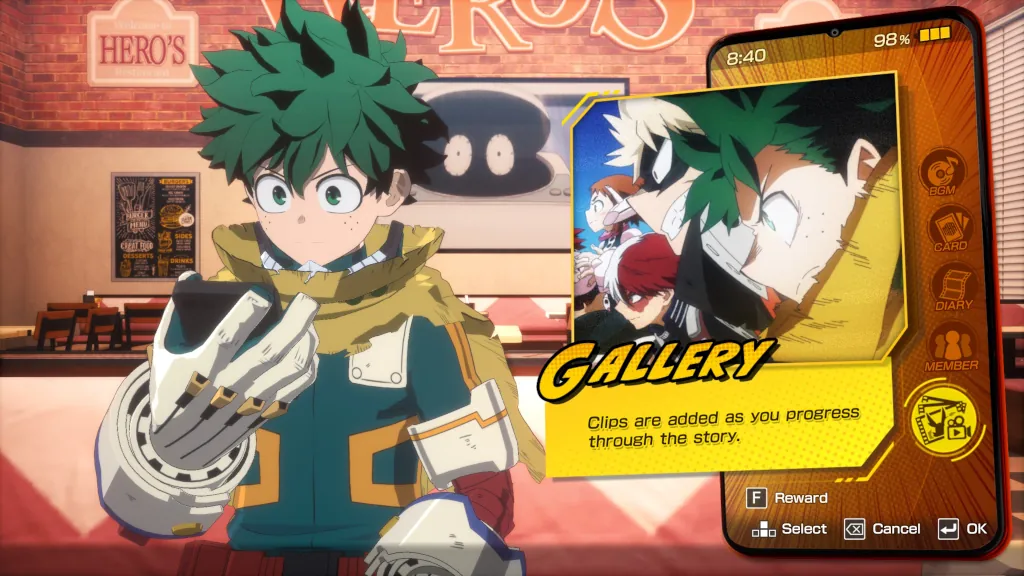 Το κεντρικό hub και μενού του παιχνιδιού είναι συνδυασμένο με την κεντρική πόλη, σε ένα μικροσκοπικό open hub area, ελέγχοντας τον Deku σε free roam, είτε μπορείς να επισκεφτείς την φυσική τοποθεσία του mode που θες να δοκιμάσεις, είτε μπορείς να διατρέξεις κανονικά το με menu από το κινητό του ήρωα έχοντας πρόσβαση σε κάθε mode με fast travel. Τα mode σε πρώτη ματιά φαίνονται πλούσια και μπορώ να πω παραπάνω από ότι περίμενα με την ποικιλία να ξεπερνάει τα απλά «battle mode», «ranked» και «story mode», με επιλογές όπως «Team up battles», «Archive battles» και «Hero Diary». Κάθε mode υπάρχει με σκοπό να προσφέρει μια διαφορετική single player εμπειρία κάτι που σέβομαι σε παιχνίδια τέτοιου είδους, που η πιο απλή κίνηση είναι να βάλεις τα βασικά modes και να το αφήσεις εκεί.