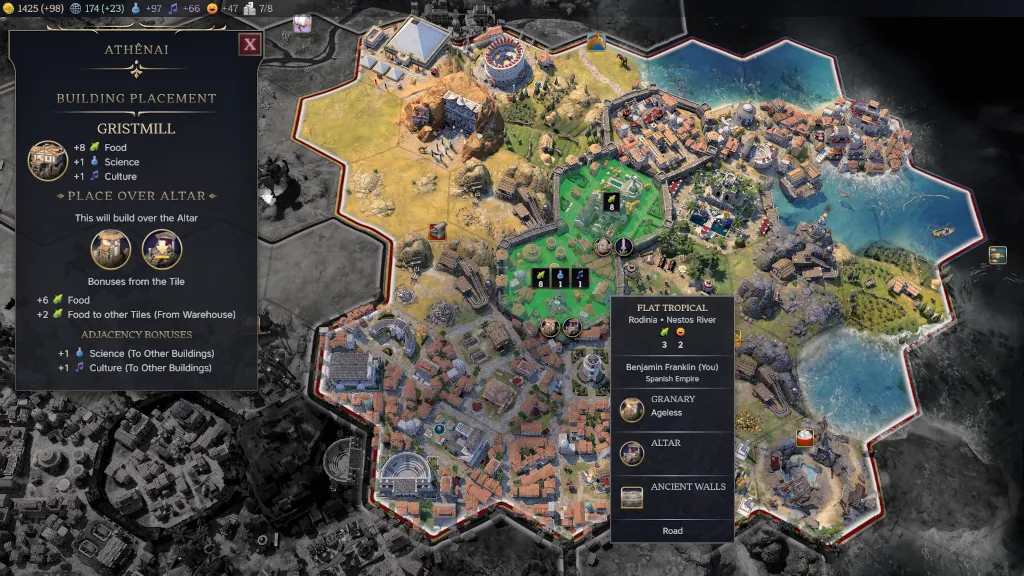 Όσον αφορά το πρώτο, η πληροφορία αυτή είναι μείζονος σημασίας καθώς το αν ακολουθούμε ίδια ή διαφορετική ιδεολογία με άλλους ηγέτες επηρεάζει άμεσα τις διπλωματικές μας σχέσης, όπου μία επιδείνωση τους λόγω ιδεολογικών διαφορών μπορεί να μας οδηγήσει σε πόλεμο. Όσον αφορά το δεύτερο, ας ξεκινήσουμε λέγοντας πως το νέο feature του “overbuilding” αφορά τη ικανότητα μας να χτίζουμε production units “το ένα πάνω στο άλλο”, έχοντας τη δυνατότητα να τοποθετούμε δύο units σε ένα tile καθώς και να αλλάζουμε το ένα από αυτά με κάτι καλύτερο όταν προχωράμε εποχές. Συνεπώς, θεωρώ αδικαιολόγητη παράλειψη το γεγονός ότι δεν μαθαίνουμε σε καμία περίπτωση του τι χάνουμε και τι κερδίζουμε τοποθετώντας ένα νέο ή έστω διαφορετικής λειτουργίας unit έναντι του υπάρχοντος. Ειδικά, όταν με το νέο mechanic αστικής ανάπτυξης η απόκτηση ενός tile δεν είναι άμεση, καθώς δεν εμπεριέχει ενεργητικά χαρακτηριστικά όπως παλαιότερα όπου οι παίκτες μπορούσαν να ξοδέψουν χρήματα για να αγοράσουν έξτρα “οκτάγωνα γης” αντί να περιμένουν την αύξηση του πληθυσμού. Δυστυχώς, αυτά αποτελούν μόνο μερικά παραδείγματα του μη λειτουργικού UI, το οποίο αν και έχει δεσμευτεί η Firaxis να διορθώσει -και είμαι σίγουρος ότι θα το κάνει-, θεωρώ ότι δεν θα έπρεπε να υπάρχουν καν ή να είναι τόσο εκτεταμένα, δεδομένου της ιστορίας και του ταλέντου της εταιρείας.