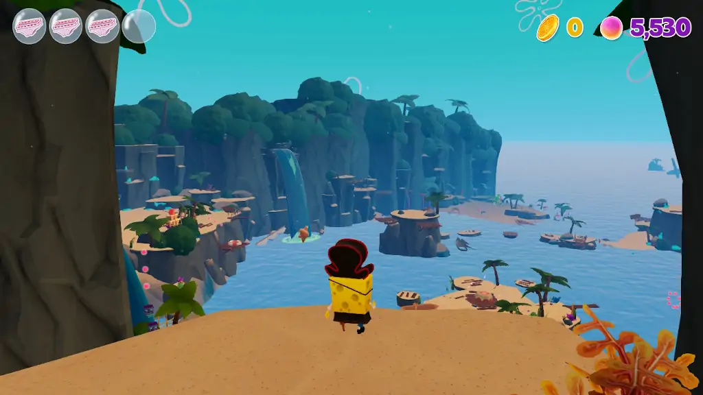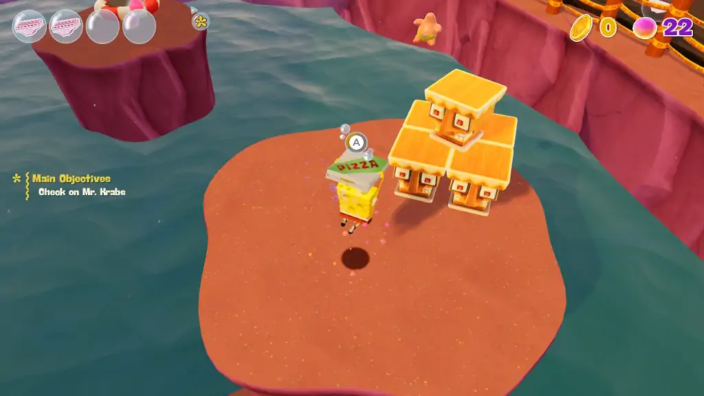 Όποιος από εσάς έχει ασχοληθεί με οποιουδήποτε είδους πλατφόρμα μπορεί να κατανοήσει πως δεν γίνεται να είναι όλα Ratchet and Clank: Rift Apart και Hollow Knight μιας κι ακόμη και αυτά έχουν μια (μικρή) επανάληψη. Στο Cosmic Shake όμως δεν μπορώ να σας πω μια στιγμή που δεν βαρέθηκα. Δυστυχώς το originality στο gameplay είναι απών και είναι τόσο μα τόσο επαναλαμβανόμενο που και οι πιο try-hard fans του δεν θα ικανοποιηθούν. Ενώ εκτίμησα την ύπαρξη των διαφορετικών όπλων ή το gliding με την πίτσα, δεν σε «αναγκάζουν» να τα χρησιμοποιήσεις αρκετά ώστε να ικανοποιηθείς. Πέρα δηλαδή από τα boss fights, μπορείς να παλέψεις όλους τους εχθρούς με το basic attack της απόχης. Το main lobby του παιχνιδιού μάλιστα είναι ο Βυθός του Μπικίνι που σιγά-σιγά τον χτίζουμε και έχει μια ημι-ανοιχτού κόσμου προσέγγιση κάτι που με παραξένευσε αρκετά. Ο μόνος λόγος που θα χρειαστεί να ασχοληθείτε με τα τριγύρω είναι καθαρά και μόνο για τα collectibles, τα οποία απαιτούν ένα αχρείαστο grind μιας και πολλά από αυτά είναι κλειδωμένα πίσω από abilities που αποκτούνται με το τέλος του παιχνιδιού. Υπάρχουν και μερικά mini-games όπως να φτιάχνεις Krabby Patties για μερικές αντζούγιες αλλά δεν είναι κάτι το ιδιαίτερο.