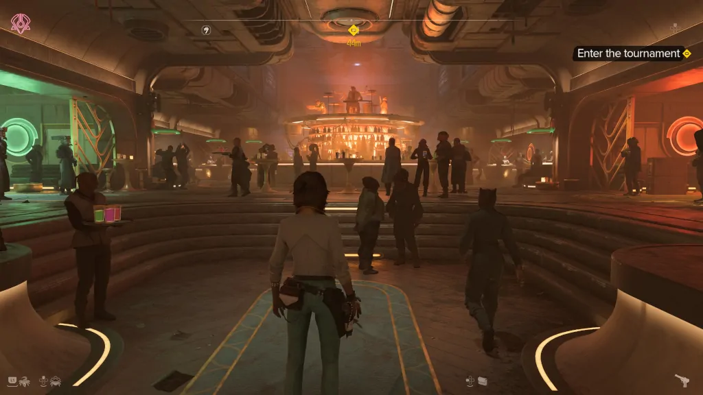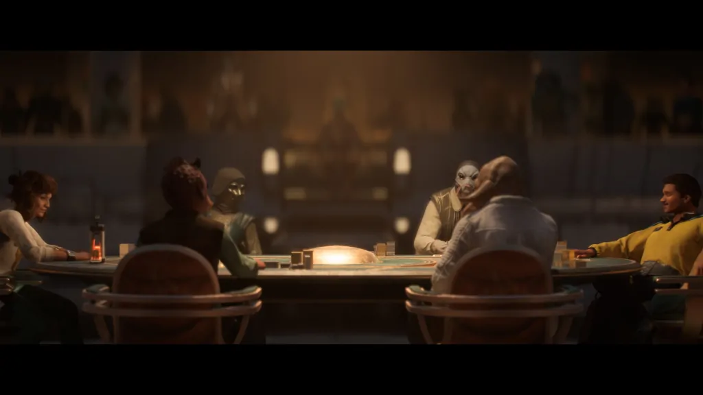 Σαν υπόθεση, το Wild Card δεν ξεπερνάει τη σφαίρα του τυπικού, στοιχείο που ναι μεν υπήρχε και στην βασική ιστορία του Outlaws με τη διαφορά πως υπήρχε τόσο ο χρόνος όσο και το περιεχόμενο σε missions, διαλόγους και interactions για να ξεδιπλωθούν οι ιστορίες, τα θέλω και οι στόχοι των χαρακτήρων και δη της Kay, δημιουργώντας έτσι ένα δυναμικό cast. Εδώ δυστυχώς αυτό δεν υφίσταται. Με εξαίρεση τον Lando που ξεδιπλώνει λίγο παραπάνω από την προσωπικότητα του -που όμως ήδη γνωρίζουμε-, δεν συμμετέχει κανένας άλλος χαρακτήρας με τον ίδιο τρόπο. Τόσο ο ND-5 που αποτελούσε βασικός μας partner in crime στο main story, όσο και η αντίπερα όχθη των συνδικάτων που σχεδόν απουσιάζουν πλήρως από τα interactions μας αλλά και η Αυτοκρατορία, όπου επιτέλους συναντούμε τον φαινομενικά ευφυή και πανούργο Governor Thorden, πλέον θυμίζουν πιο πολύ cameos παρά βασικοί χαρακτήρες του παιχνιδιού. Και δεν αναφέρω τυχαία τη λέξη “παιχνίδι” μιας και στο Wild Card έχει διττό ρόλο. Βλέπετε, μπορεί το DLC να γυρίζει γύρω από το Sabacc και το μυστικό τουρνούα του πάνω στο “πλωτό” καζίνο Merinia, όμως σε αντίθεση με το Gwent στο Witcher 3, εδώ δεν παίζουμε και τόσο πολύ. Για την ακρίβεια παίζουμε ελάχιστα. Δυστυχώς, αυτό είναι και το μεγαλύτερο παράπονο μου. Η υπο-χρησιμοποίηση του Sabacc ως μέσο εξερεύνησης του υποκόσμου όσο και της Merinia ως χάρτη και ως event. Πολλοί μπορεί να μην θυμούνται την γενική υπόθεση του Casino Royale, όμως όλοι θυμούνται τη θρυλική σκηνή με τον Πράκτορα 007 και τον κακό που υποδύεται ο Mads Mikkelsen πάνω από την πράσινη τσόχα να διασταυρώνουν τα πνευματικά ξίφη τους. Το ίδιο δεν θα μπορεί να ειπωθεί και για την Merinia μετά το τέλος του DLC μιας και η παραμονή μας εκεί είναι ιδιαίτερα σύντομη και χωρίς κάποιο standout mission παρά την εξαιρετική δουλειά που έκαναν στην αισθητική, στη μουσική και στην ατμόσφαιρα της.