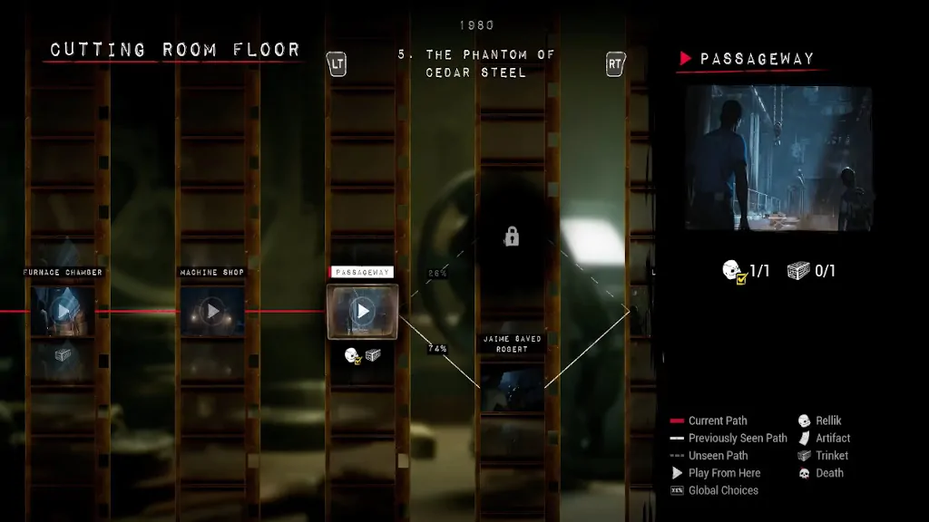 Το πρόβλημα των “σωστών” επιλογών καταφέρνει να λυθεί εν μέρει με τη χρήση του Cutting Room Floor, το οποίο πιστεύω πως είναι ένα ιδιαίτερα χρήσιμο εργαλείο για τέτοιου είδους παιχνίδια. Ο συγκεκριμένος μηχανισμός μας αφήνει να δούμε όλες τις πιθανές εκβάσεις ταυτόχρονα, από όλα τα κεφάλαια. Για την ακρίβεια, βλέπουμε τις σκηνές που έχουμε ζήσει ενωμένες από το «Red Thread of Fate», δείχνοντάς μας έτσι τη διακλάδωση των επιλογών μας. Εκεί βλέπουμε επιπλέον τα ποσοστά των επιλογών που πάρθηκαν από τους υπόλοιπους παίχτες, γευόμενοι έτσι μια συνολικότερη εικόνα για τις επιλογές και την εξέλιξη της ιστορίας τους. Ο προβληματισμός μου με το συγκεκριμένο εργαλείο είναι ότι παρόλο που προσφέρει υψηλό replayability στο παιχνίδι, έχει ελάχιστα σημεία πρόσβασης για να αλλάξεις την ιστορία πιο άμεσα, αναγκάζοντάς σε να ξαναπαίξεις ολόκληρα κεφάλαια για να καταλήξεις στο αποτέλεσμα που επιθυμείς. Όμως, είναι ένα βήμα προς την σωστή κατεύθυνση και αποτελεί μηχανισμό που σίγουρα θα ήθελα να δω και στα μελλοντικά παιχνίδια της Supermassive, καθώς το μεράκι της δημιουργίας αυτής της επιλογής είναι εμφανές.