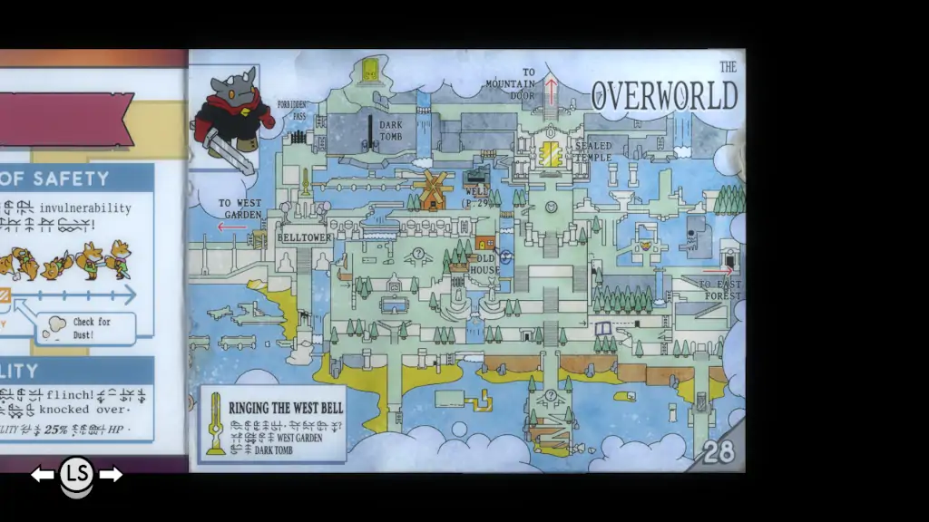 Με αυτά κατά νου, καθώς συνέχιζα “τυφλά” την εξερεύνηση μου δίχως τίποτα να με καθοδηγεί, δεν άργησα να καταλάβω πως όλο το νόημα του Tunic βρίσκεται στο ότι δεν υπάρχει καμία ξεκάθαρη οδηγία και πώς εξαρτάται από τον παίκτη η πορεία της περιπέτειας, όχι βάσει της ιστορίας, αλλά βάσει τη εξερεύνησης. Ίσως αυτή να είναι εν μέρει και η ομορφιά του, ένας από τους λόγους που κατ’ εμέ το καθιστά ξεχωριστό. Το παιχνίδι μάλιστα φτάνει σε σημείο να μην θέλει με τίποτα να διευκολύνει τον παίχτη, αφού συμπεριλαμβάνει δική του γλώσσα/γραφή, έτσι ώστε στις περισσότερες περιπτώσεις να πρέπει να γίνουν όλα κατανοητά βάσει των εικόνων που συλλέγονται στο εγχειρίδιο και με αυτό τον τρόπο ξεδιπλώνεται με αρκετά πιο ενδιαφέρον τρόπο και η πλοκή του.