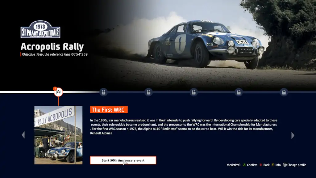 Η επέτειος των 50 ετών του παγκόσμιου πρωταθλήματος Rally είναι γεγονός και το δέκατο κεφάλαιο των παιχνιδιών WRC ήρθε για να τη συνοδέψει. Η KT Racing κατάφερε να αρπάξει την ευκαιρία και να μετουσιώσει σε νέο περιεχόμενο αυτή την επέτειο, προσφέροντας για πρώτη φορά το Anniversary Mode. Κορυφαίοι αγώνες rally από το 1973 μέχρι και σήμερα, που έχουν μείνει στην ιστορία -ανάμεσα τους και το Rally Aκρόπολις- είναι πλέον διαθέσιμοι, επαναφέροντας στο προσκήνιο μερικές από τις μεγαλύτερες στιγμές που έχει ζήσει ο θεσμός. Ένα κομμάτι ιστορίας για να θυμούνται οι παλιοί και να μαθαίνουν οι νεότεροι. Η συγκεκριμένη προσθήκη αποτελεί και την μοναδική στο θέμα των modes, ενώ η εισαγωγή της στο career mode λειτουργεί θετικά, αποφορτίζοντας την ένταση των πρωταθλημάτων και των υπόλοιπων event. Το βασικό ερώτημα που μου γεννάνε σειρές όπως το WRC είναι το κατά πόσο τα παιχνίδια βασίζονται σε κάτι ουσιαστικά διαφορετικό ή αν χρησιμοποιούν ως βοηθητικές ρόδες τους προκατόχους του.