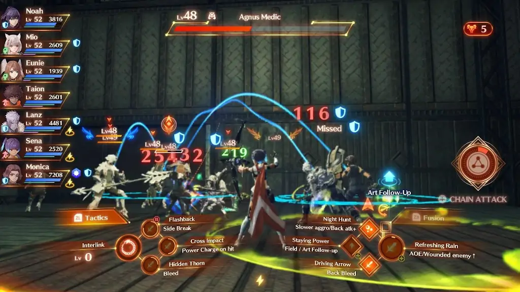 Περνώντας στο combat system, ο κάθε χαρακτήρας κάνει level up το δικό του class, το οποίο είναι ανεξάρτητο από το γενικό level του χαρακτήρα. Το καθένα έχει την δική του ενδυμασία, όπλο, καθώς και τις δικές του ικανότητες (arts), που έχουν τα εφέ που περιμένουμε από ένα RPG: healing, damage, AOE ,stun, κτλ. Αυτά τα arts χρησιμοποιούνται με βάση cooldown και συνδυάζονται μεταξύ τους, είτε για να κάνουν παραπάνω ζημιά είτε για να ακινητοποιήσουν τους αντιπάλους με κάποιον ειδικό τρόπο. Ακόμα, υπάρχουν και τα chain attacks, που σας επιτρέπουν να σταματήσετε τον χρόνο και να δώσετε ξεχωριστές εντολές στους χαρακτήρες του party σας, χωρις να προλάβει να αντιδράσει ο αντίπαλος σας.